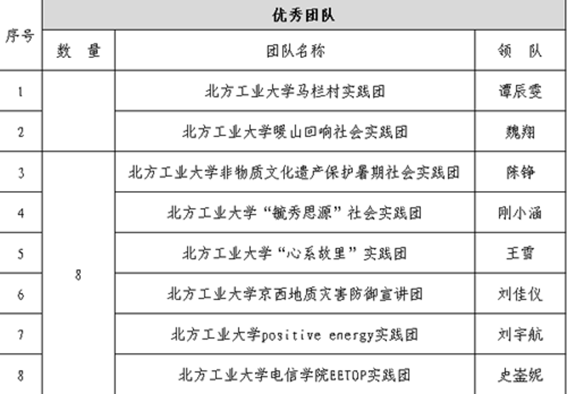 2018年暑期校团委组织开展了以“青年服务国家”为主题的大学生暑期社会实践活动。通过多种形式组织动员在校学生立足首都,面向全国,积极开展形式多样、主题鲜明、特色突出的暑期社会实践活动,充分发挥了社会实践作为加强和改进大学生思想政治教育重要途径的优势,取得了良好效果。为选树典型、表彰先进、推广经验,校团委组织开展了暑期社会实践的总结评审工作,经专家评审,我校有8支团队、8位教师、8名同学脱颖而出,获评推荐“2018年首都大中专学生暑期社会实践优秀团队、先进工作者、先进个人”的资格,现将名单公布如下。