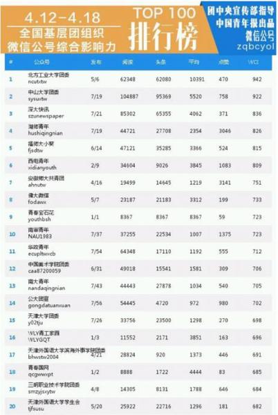 4月20日,中国青年报官方微信号发布了上一周(4月12日-18日)全国基层团组织微信公号综合影响力排行榜,我校团委的官方微信号“yl7703永利集团团委”以周总阅读量6万多和WCI指数达942而排名第一。这是我校团委微信公号开通以来第二次进入全国基层团组织微信公号综合影响力周排行榜前十名,2015年3月9日获得第八名。
