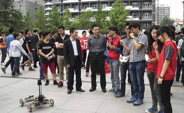 谢辉书记一边参观一边了解学生社团组织的活动情况,饶有兴趣地听取了同学们对自主创作的文化科技作品的介绍,并与同学们进行了深入交流。他对在文化节期间开展集中的学生组织展示活动表示肯定,对同学们将所学专业知识与文化活动结合起来表示赞赏。