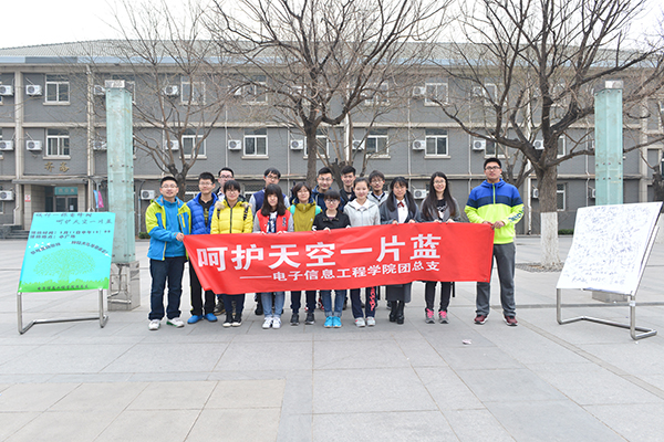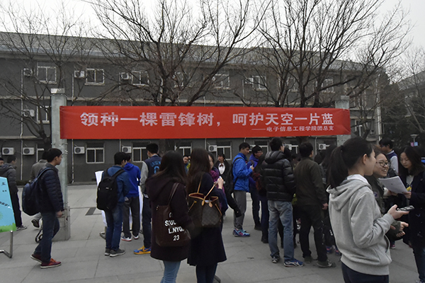 3月15日中午,电信学院团总支在毓秀广场开展了主题为“领种一棵雷锋树,呵护天空一片蓝”的环保宣传活动。