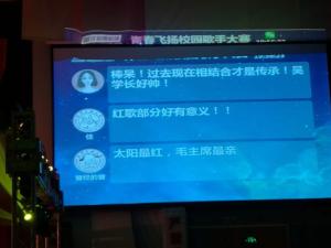比赛全程,场下观众热情爆棚。学校党委副书记田红芳等领导和同学们纷纷在微信墙上送出了自己对青飞的祝福,并对本次比赛做出了高度的评价。田红芳副书记在微信中表示:“这是一届非常有意义的青飞赛,为同学们的精彩表现点赞!用90后的演绎手法唱响红歌,同学们太有才了!为你们点赞!”
