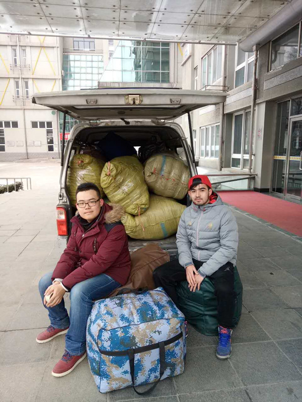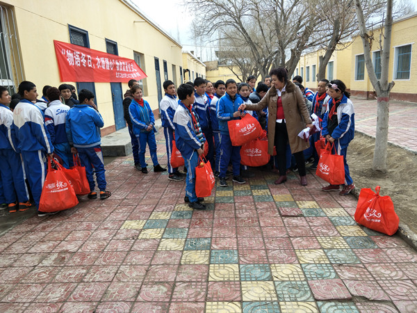 依提木孔中学新学期刚开始不久,2月27日上午,学校老师早早的悬挂起物资发放仪式的条幅,数百名同学像迎接节日一样,穿戴着整齐的校服,怀着无比激动的心情聚集起来,眼中满是期待。因为今年寄送物资颇费周折,艾力西尔同学已经返校上学,正当他发愁如何组织发放仪式的时候,当地的小伙伴都主动愿意帮他将爱心传递下去,自发的组织了志愿小分队,当志愿者将衣物送到中学生手中的时候,所有人都会深深鞠躬,或用维语或用汉语表达着谢意,志愿者们也很开心的通过网络与学院分享了激动的时刻。