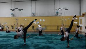 参观完工作室,在王建民老师的带领下,同学们走进了北京市国际艺术学校排练厅,现场观看了即将代表中国参加摩纳哥杂技比赛的队员训练。通过近距离的接触与交流,学生们感受到了与自己同龄的杂技演员身上肩负的崇高报国理想和使命感。杂技演员们在日复一日的训练中坚守初心,他们身上勇攀高峰的精神气魄鼓舞了到访参观的所有人。