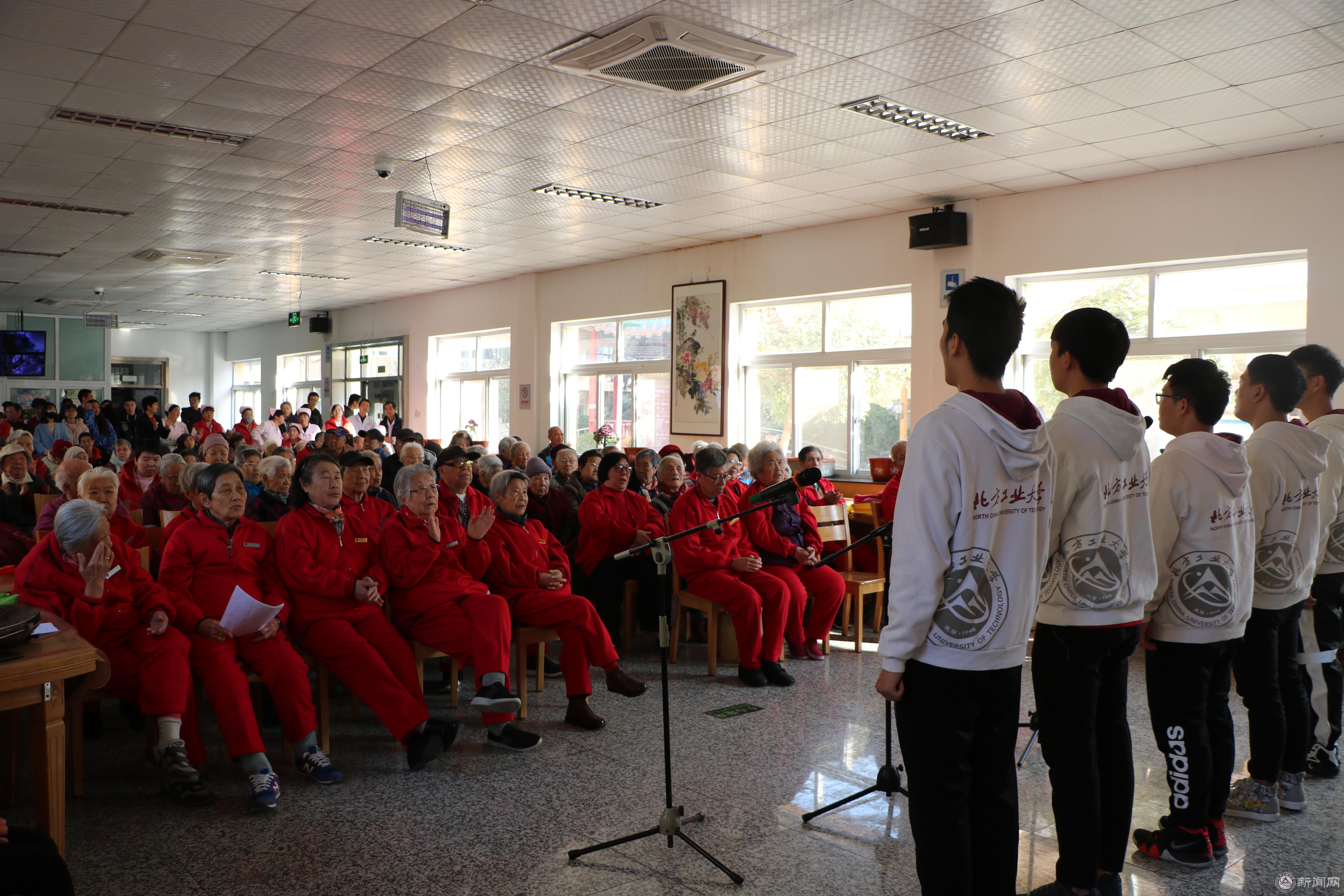 土木工程学院与石景山区社会福利院共建的“亲近夕阳”志愿服务活动始于1999年,至今已有二十个年头,恰逢今年改革开放四十周年,可谓双喜临门。活动开始前,志愿者们接来一位行动不便的老人入座,随后联欢活动在志愿者们合唱《红旗飘飘》的歌声中拉开帷幕,过程中,志愿者们和福利院老人们相继上台演出,载歌载舞,亲热互动,台下的老人们也看得津津有味,不时发出阵阵掌声。