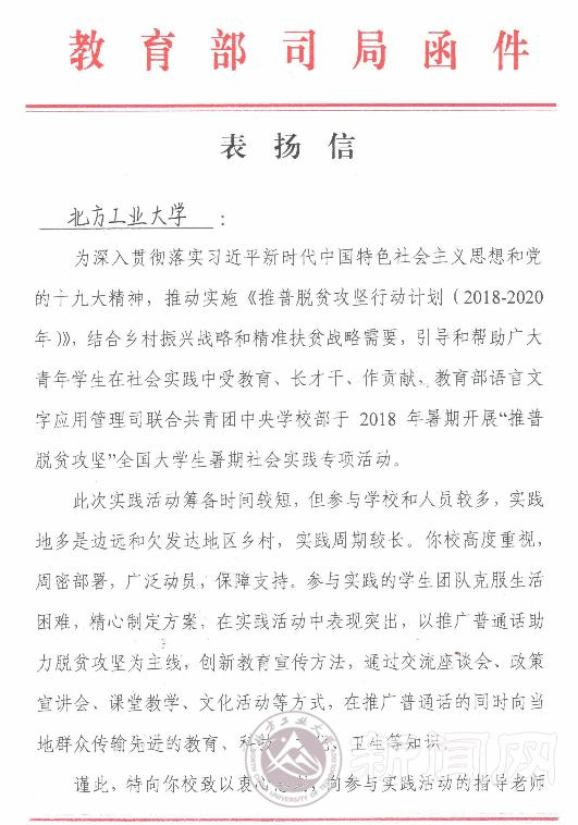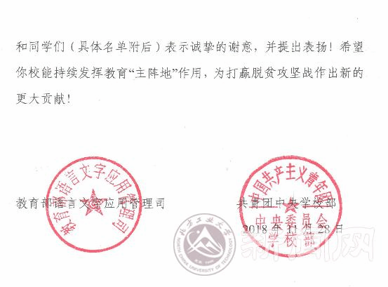 近日,学校收到教育部语言文字应用管理司和团中央学校部发来的表扬信,对我校参加2018年“推普脱贫攻坚”全国大学生暑期社会实践的优秀团队提出表扬。