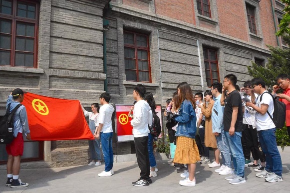 在新文化运动纪念馆前,同学们佩戴团徽,整齐列队,共同高举右拳,重温入团誓词。一百年前,伟大的五四运动爆发,广大青年学生在这场运动中担负起了改变国家和民族危亡命运的重担,点燃了新民主主义革命的熊熊烈火,开启了中国新时代的开端。重温入团誓词、追忆五四历史、弘扬五四精神,更加坚定了作为当代大学生要为国家民族作奉献的理想信念。