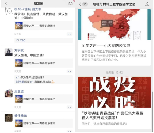 学院组织开展团员线上承诺活动,以视频宣传的方式号召广大团学干部正向发声,严行践诺,学院一千余名团员参与。组织“以笔铸锋 青春战疫”作品征集大赛,在学院微信公众号开设线上“小荠菜防疫指南”为学生健康保驾护航。