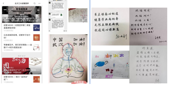 经济管理学院开展了以“爱是永恒”为主题的手绘手写原创活动。同学们手写加油话语,对一线工作者们表达感谢,并为武汉祈福加油。“没有一个冬天不可逾越,没有一个春天不会到来”、“愿山河无恙,人间皆安”……同学们的句句话语中都充满了对战胜疫情的信心与对一线工作者最崇高的敬意。学院共计推送6期内容,线上浏览量近3000人次。发布《致身在湖北及湖北籍师生的一封信》,向身在湖北地区的13位师生传递学校和学院的关注、关心和关爱。