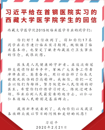 在藏历新年来临之际,中共中央总书记、国家主席、中央军委主席习近平2月21日给正在北京首钢医院实习的西藏大学医学院学生回信,肯定他们献身西藏医疗卫生事业的志向,勉励他们珍惜学习时光、练就过硬本领、服务基层人民,并向他们以及藏区各族群众致以节日的问候和美好的祝愿。