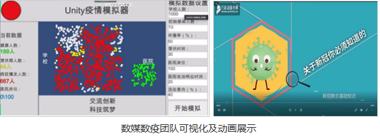 数媒数疫团队由张凤全老师指导,创新实践内容为新冠肺炎疫情的模拟可视化。利用Unity引擎搭建的模拟器,输入从看到的新闻以及报道中获得的各项指标就可以模拟疫情的爆发情况。同时团队还制作了防疫小动画,以此来让同学们更加了解疫情的严重性以及如何预防。