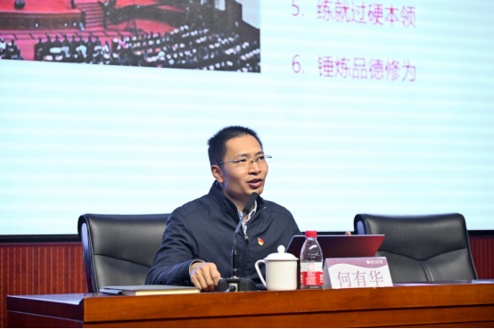 何有华做了题为“如何当好一名学生干部”的专题报告。他从“我是谁”“我能做什么”“我要做什么”“我要怎么做”四个方面谈了学生干部应具备的素质、能力和工作内容、工作方法。他强调,学生干部应具有政治素质、道德修养、责任意识和奉献精神,要提高政治判断能力、沟通协调能力和组织领导能力,要带好队伍、加强班风建设、积极作为。