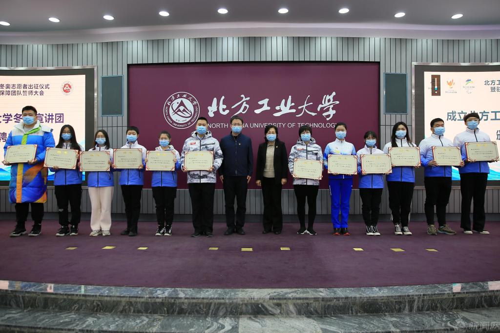 副校长栗苹、石景山团区委书记贾曦为冬奥宣讲团成员颁发聘书。冬奥宣讲团的成立,为生动讲述冬奥故事,弘扬志愿服务精神,展示北方工大形象提供了组织保障。