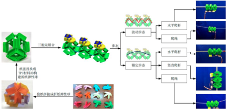 该作品通过揭示折纸弹性球模型所蕴含的超材料变形机制,成功研制了一种新型的多胞元多模态可重构软体机器人,实现了全向蠕动爬行、爬绳、爬杆等多模态运动。特别是突破了现有的吸附式、轮式、夹持式、缠绕式等爬杆机器人设计原理,首次实现了一种基于折纸弹性球多级耦合变形机制的爬杆机器人,具有结构简易、制造成本低、可模块化扩展等优点,具有潜在的广阔应用前景。相关研究成果发表在国际机器人领域著名期刊《Soft Robotics》上,获国际同行、国内评审专家广泛认可。