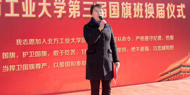 仪式上校党委副书记田红芳发表讲话。她指出,国旗班队员是北方工大校园里离国旗最近的人,队员们迎酷暑、斗严寒,以崇高的爱国热情、吃苦耐劳的精神、严于律己的品质赢得了校内师生的一致好评。升国旗活动已成为我校爱国主义教育、集体主义教育、革命主义教育的重要载体。爱国主义是中华民族最重要的精神财富,她希望新一届国旗班成员再接再厉,牢记使命、勇于担当、践行责任、刻苦训练,将“爱国、爱旗、爱校”精神融入日常学习生活中,用实际行动感染身边的同学,涵养校园文化。她强调,全体北方工大师生都要有一颗爱国、报国的心,广大师生要将爱国和爱党、爱社会主义有机统一起来。让爱国主义精神成为每名北方工大人的坚定信念和精神依靠。