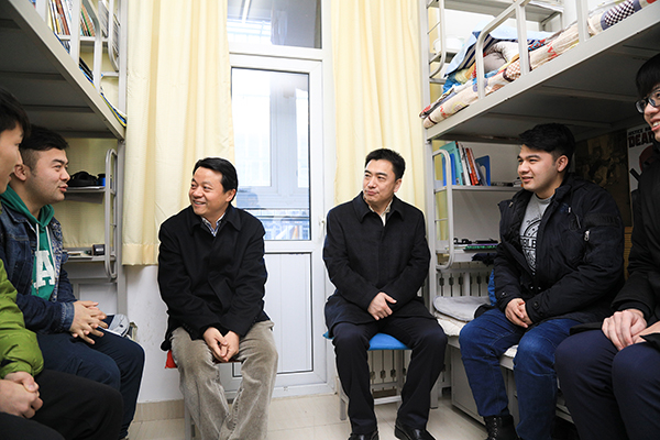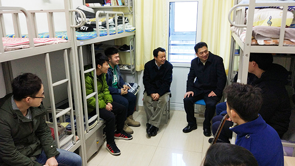 随后,振邦书记一行来到女生公寓雅斋和男生公寓馨斋,看望寒假留校学生。他与留校学生亲切交谈,深入了解留校学生在寒假期间的学习、生活安排,并为留校学生送上慰问礼包。在雅斋,同学们介绍了各自的学习情况,以及寒假期间参与实习的经历;在馨斋,来自新疆的努尔艾力·沙吾提同学兄弟两人介绍了自主创业的情况。振邦书记在与同学们交谈中表示,我们国家正处在很好的发展时期,希望同学们珍惜发展机遇,在鸡年能够继续“闻鸡起舞”,在专业学习上精益求精,积极参加各种实践锻炼,将来为国家的建设发展做出贡献。
